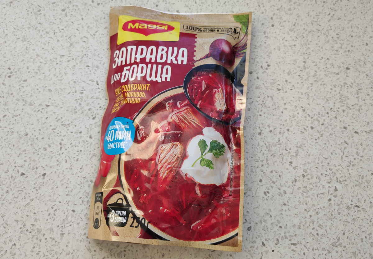 Совершенно случайно попался на полке магазина заправка для борща. Я люблю уделить время готовке, но решил попробовать сварить быстрый, ленивый борщ. В составе овощи, томатная паста и зелень. На удивление нет химии, только уксус, соль и сахар. Но для этой разновидности борща это нормально. Инструкция хитрая. "Возьмите 300 рг. мяса и сварите 2 литра бульона" Кто то расскажет как это сделать? Иду на нарушение инструкции и варю нормальный бульон из курицы.