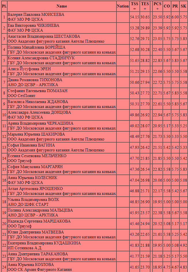 Полина Борейша (52.68 - 4 место) была сегодня лучшей версией самой себя и смогла даже опередить одногруппницу Алису Эрен, а мы в полной мере смогли оценить ее прогресс за год, ведь на прошлогоднем Первенстве Москвы Поля заняла лишь 32 место. Зажигательное, очень яркое выступление, с уверенным исполнением всех технических элементов, с большим количеством эффектных фан-спиралей и без очевидных пробелов в программе, которые можно было бы назвать минусами - и прыжки, и вращения, и дорожка шагов получили высокие по меркам данного турнира GOE. Вторая оценка могла быть и повыше (при второй технике дня Полина получила девятые компоненты), но так решили судьи. Есть у Полины каскад 3+3, так что и в элементах, если все пойдет по плану, можно ожидать от нее высокого результата.