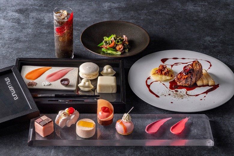 Токийский бутик-отель Kimpton Shinjuku выкатил на днях акционное и действующее до конца февраля послеобеденное чаепитие, разработанное в коллаборации с косметическим брендом Shu Uemura. Hanami glacé Afternoon Tea называется. Часть пирожных этого чаепития стилизована под разные косметические штучки типа коробочки с тенями и чего-то еще, в чем я, в силу предметного невежества, совершенно не разбираюсь. Но это все, на самом деле, ерунда, такие стилизации появляются достаточно часто. А вот что не ерунда, так это добавленный в подачу съедобный косметический интерактив. В это чаепитие может быть включен набор, составленный из белых пирожных — там губы из шоколада, кругленький макарон и что-то квадратное — и съедобных красок с кисточками. Ну и, соответственно, если взять чаепитие с этим набором, то можно сидеть, пить чай, красить шоколадные губки и потом есть их. Это прикольно. Следует отметить, что в этом отеле и обычный, неакционный, Afternoon Tea красивый. Сейчас — в клубничном стиле, но э