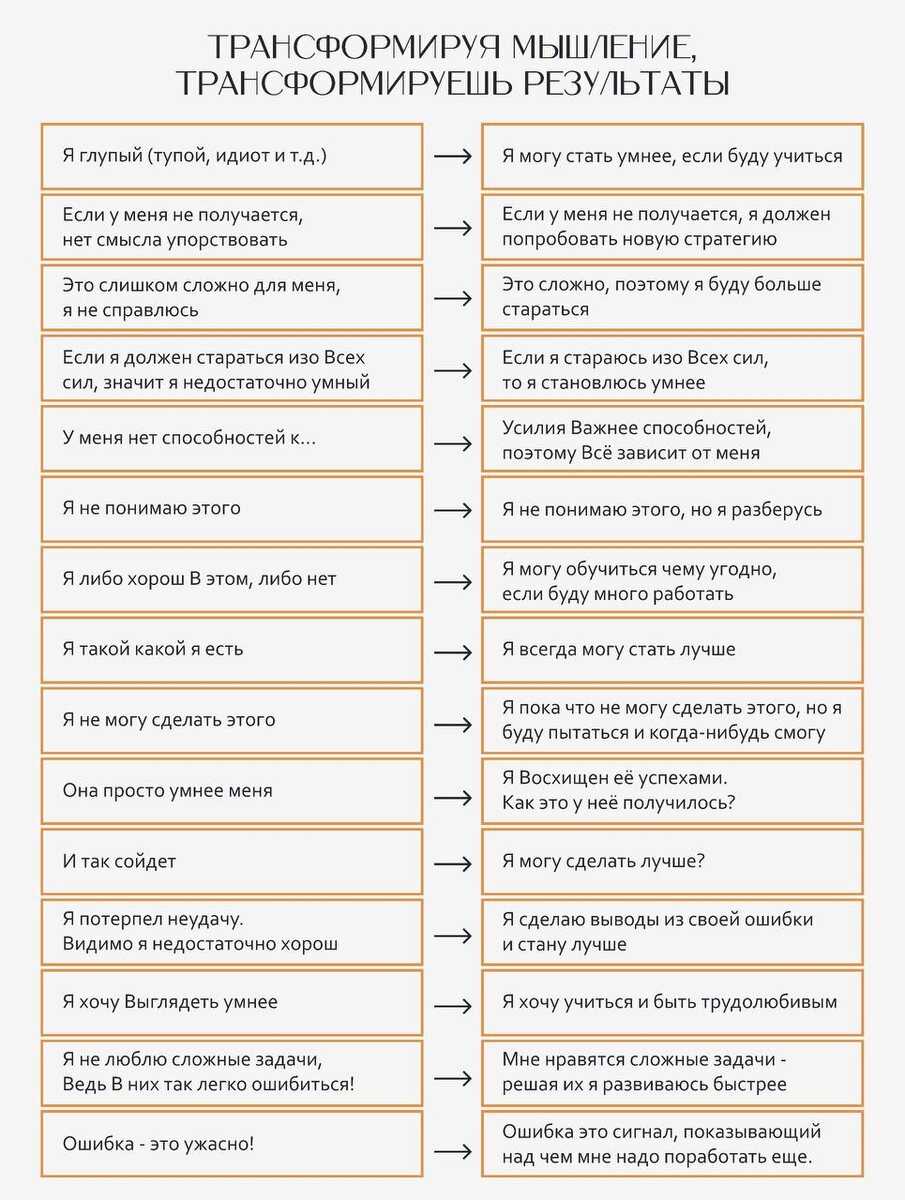 Друзья, давайте поговорим о том, что зачастую мешает нам двигаться вперед. Это не обстоятельства, не нехватка времени и даже не внешние факторы. Это наши мысли. Да-да, именно они! Часто мы сами ставим себе ментальные барьеры, не даем себе шанса попробовать, боимся ошибок или просто застреваем в привычных установках. Но что если поменять угол зрения? Давайте проверим на примерах: ❎«Я глупый»➡️«Я могу стать умнее, если буду учиться». ❎«Если у меня не получается, нет смысла упорствовать»➡️«Если у меня не получается, я должен попробовать новую стратегию». ❎«Это слишком сложно для меня, я не справлюсь»➡️«Это сложно, поэтому я буду больше стараться». ❎«У меня нет способностей к...»➡️ «Усилия важнее способностей, поэтому все зависит от меня». ❎«Я потерпел неудачу, видимо я недостаточно хорош»➡️«Я сделаю выводы из своей ошибки и стану лучше». 👉Каждая мысль из левой колонки — это тормоз. А каждая мысль из правой — это двигатель. И только вы решаете, что выбрать: стоять на месте или двигаться в