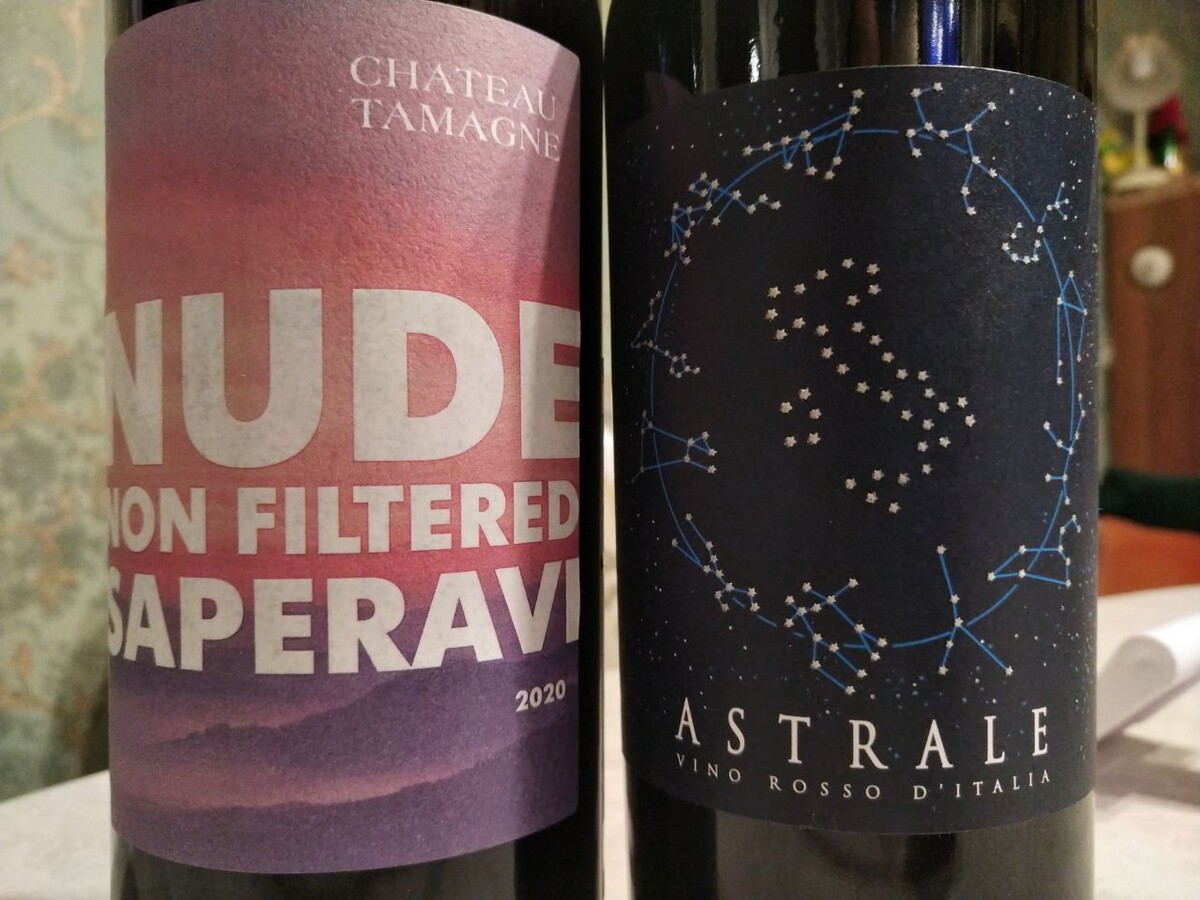 Nude Saperavi - это "Кубань-вино", нефильтрованный саперави урожая 2020 года. Розлив июнь-2022 Astrale Rosso - популярное у нас итальянское вино 2020 года урожая. Смесь нескольких сортов: примитиво, монтепульчано, мерло, неро д'авола. Разлито в феврале 2022. И, так как сорта не пересекаются, то есть, нет саперави в Италии, а у нас нет половины сортов, из которых сделано Astrale, сравним их как есть! Сначала по цене. Тут примерный паритет. В зависимости от скидки или места продажи их можно было купить от 700 до 1000. Но в последнее время кубанское вино дешевле, потому что итальянское уже перевалило за тысячу. Astrale Сладкий аромат давленных ягод - я так уже писал о каком-то "сладком сухом вине". Смородина, вишня, малина. Фрукты. Слива. Во вкусе помимо обильной сладости есть небольшая, пусть и не всё компенсирующая, кислинка. Красная смородина хорошо ощущается в развитии. Танинов мало, очень питкое, сложности нет. Вкус продолжает аромат. Достаточно насыщенное. Послевкусие очень короткое