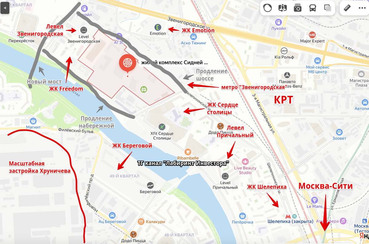 📍ЖК «Sydney City», застройщик «ФСК», адрес: Москва, ул. Шеногина, д. 2. Бизнес-класс, 3 вида отделки: черновая, чистовая, вайтбокс. Метро «Звенигородская» 7 мин пешком, выдача ключей: сдан — 12.2027. Текущие цены от: Студия (29 м2) — 15,8 млн руб. ЕВРО-2 (43 м2) — 21,9 млн руб. ЕВРО-3 (62 м2) — 29,2 млн руб. Чем знаменит ЖК «Sydney City»? А тем, что это один из самых скандальных проектов в Москве. Не ругал его только ленивый, правда, есть те, кто и хвалил, но на это у них были свои причины. Ну а я попробую быть объективным и честно «разобрать» этот проект. Итак, начинаю. Сначала напишу о локации и о её нюансах и всё отмечу на карте вверху. Первое: с транспортной доступностью пока всё плохо. Метро в пешей доступности — нет, а новые дорожные развязки еще не построены. Но это пока, поскольку через два года всё изменится: вновь откроется станция «Шелепиха», которая сейчас временно не работает, а вместе с ней и новая станция «Звенигородская», которая будет находиться в 7 минутах пешком от