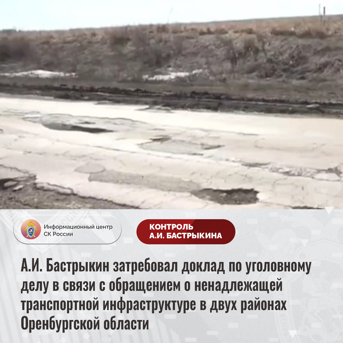 А.И. Бастрыкин затребовал доклад по уголовному делу в связи с обращением о ненадлежащей транспортной инфраструктуре в двух районах Оренбургской области В Информационный центр СК России поступило обращение по вопросу ненадлежащего содержания автомобильной дороги «Бугуруслан – Заглядино» в Асекеевском и Бугурусланском районах. На протяжении длительного времени дорожное полотно разбито, на его поверхности имеются многочисленные ямы и колеи, что создает значительные трудности при передвижении транспортных средств, а также приводит к регулярным дорожно-транспортным происшествиям. Отмечается, что обращения в компетентные органы результатов не принесли, мер к организации ремонтных работ не принимается. Ранее указанная ситуация освещалась в СМИ. В СУ СК России по Оренбургской области расследуется уголовное дело, возбужденное по поручению А.И. Бастрыкина. Председатель Следственного комитета Российской Федерации Александр Иванович Бастрыкин затребовал у руководителя СУ СК России по Оренбургской