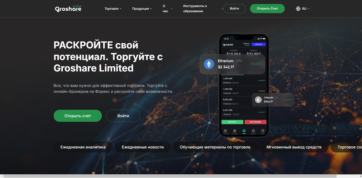 Брокер Groshare Limited (grosharelimited.com) – это независимая брокерская компания, открывающая доступ на финансовые рынки институциональным, корпоративным и индивидуальным клиентам. Компания grosharelimited.com – команда профессионалов, объединяющих беспрецедентный отраслевой опыт в мире финансов. Жаль только, что все это ложь. Конечно же, рассматриваемый проект в принципе не является брокером. Это даже не кухня. Это очень простой, полностью лживый лохотрон, сотрудничество с которым абсолютно недопустимо. Есть все основания полагать, что перед нами – очередной офшорный брокер, который мастерски ездит по ушам своим клиентам, тихонько на них зарабатывая. Единственная его задача – заработать для себя деньжат, и все. Сайт: https://grosharelimited.com/