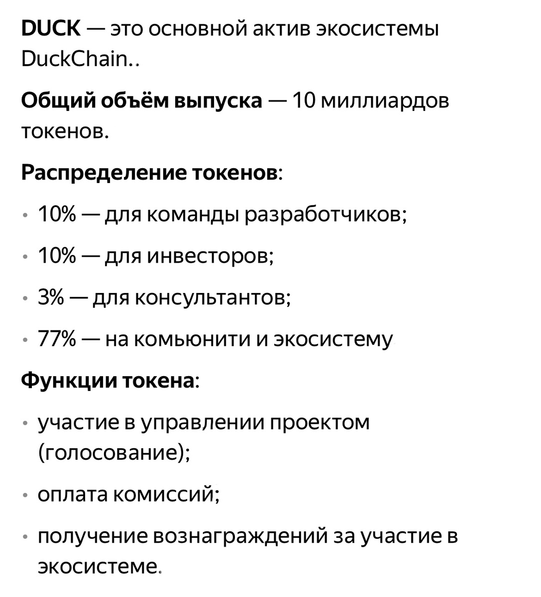 DUCK — это проект, который стремится быть не просто криптовалютой, а полноценной экосистемой для децентрализованных финансов и новых типов криптовалютных сервисов. Основатели DUCK создавали монету с целью предоставить пользователям платформу, которая позволяет им не только проводить быстрые и дешевые транзакции, но и активно участвовать в сообществе через использование токенов в различных областях.