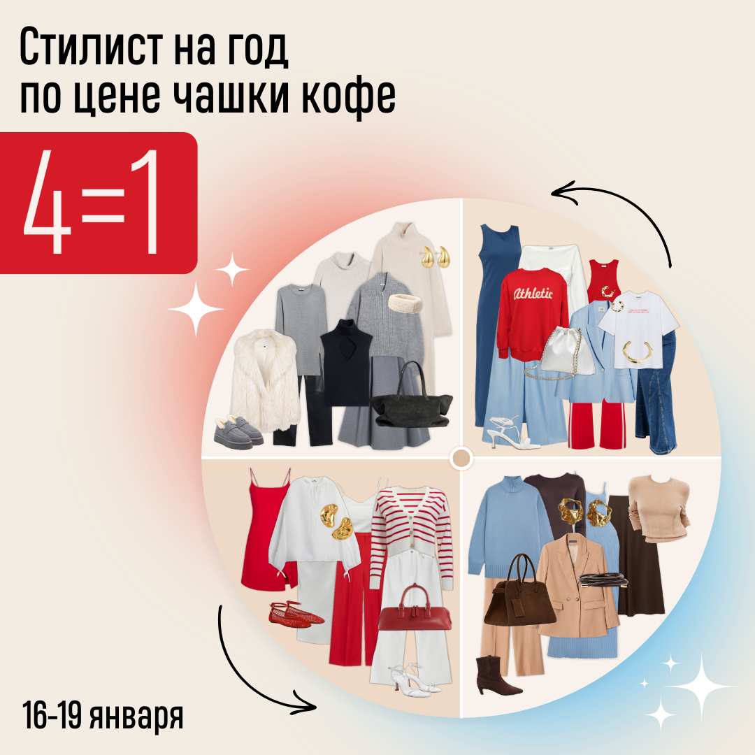 Стилист на год по цене ☕️🥐 завтрака в кафе. 💊💊💊💊 4 капсулы и весь год мы с вами на связи: подбираем и привозим капсулы. ⠀ ☝🏻16-19 января ⠀ Вы заказываете капсулу, как обычно, а получаете 4 в течение 2025 года. Акция действует на все тарифы. Купили ПРО капсулу – получаете 4 ПРО, купили УЛЬТРА – 4 УЛЬТРА. ⠀ Во сколько обойдется каждая капсула по акции: 💸МИНИ: 298₽ вместо 1 190₽, 5+ вещей в капсуле
