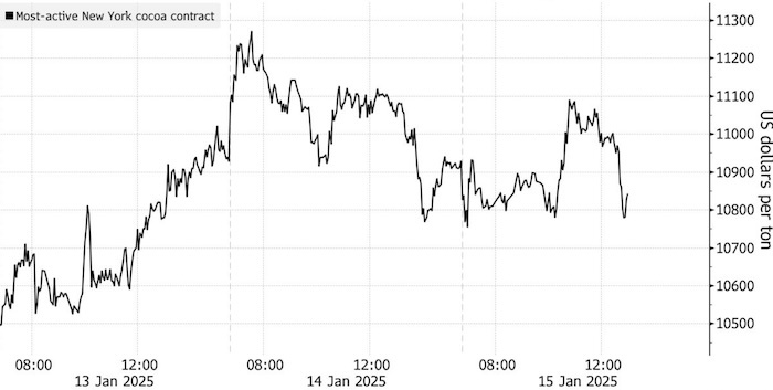Фьючерсы на какао снизились перед публикацией данных по переработке за четвертый квартал. Эта отчетность от ключевых производителей поможет понять соотношение спроса и предложения в условиях рекордно высоких цен Цены на какао. Источник: Bloomberg Наиболее активный контракт в Нью-Йорке показал резкие колебания в среду, упав на 1.9% после роста на 1.8% ранее. Трейдеры внимательно следят за так называемым помолом, в процессе которого какао-бобы перерабатываются в масло и порошок, используемые в производстве всего: от шоколадных батончиков до мороженого. Данные по Европе, Азии и Северной Америке будут опубликованы в четверг. По мнению аналитиков финансовой компании StoneX Group Inc. Рафаэля Боргеса и Лукки Беззона, ожидается, что данные снова будут неоднозначными. «Однако, если цифры покажут более резкое падение объемов переработки, рынок может расценить это как признак того, что основные потребительские рынки начинают сокращать использование какао-продуктов, особенно какао-масла», — напис