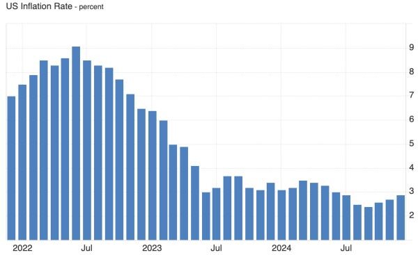 Уровень инфляции в США за декабрь, о котором стало известно днем 15 января, оказался на уровне ожиданий и составил 2,9%. Уровень инфляции в США за последние 3 года. Источник: Trading Economics На рынках капитала вздохнули с облегчением. За последние несколько недель опасения по поводу инфляции стали причиной падения цен на такие активы, как акции и биткоин. Цена биткоина смогла существенно вырасти после опубликованных данных по инфляции и вновь приблизилась к отметке в $100 000. В начале недели один биткоин стоил менее $90 000. С середины декабря прошлого года рынки капитала вошли в режим коррекции. На последнем заседании центрального банка 18 декабря Федеральная резервная система повысила прогноз инфляции и предложила лишь два снижения процентной ставки на 2025 год. В результате возникли опасения, что новый всплеск инфляции полностью сведет на нет планы по снижению процентных ставок. Между тем, неожиданно сильные данные по рынку труда в США дали понять, что экономика США отнюдь не нах