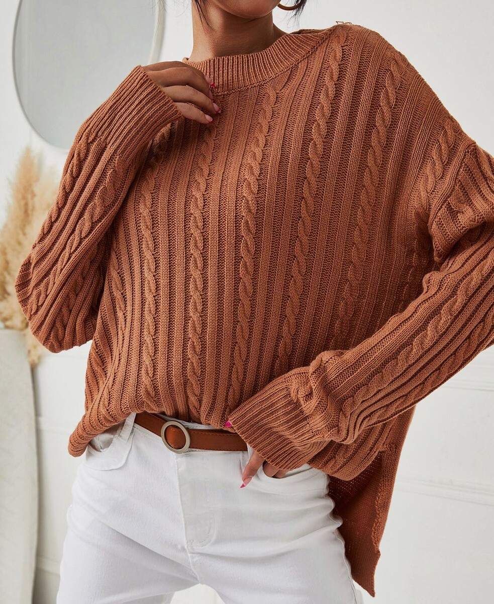 Стильный терракотовый свитер свободного кроя с боковыми разрезами. Возможно, спинка чуть длиннее переда. По фото не определишь, так как свитер спереди заправлен в брюки, но в прошлом году были в тренде такие модели оверсайз с боковыми разрезами и удлинённой спинкой.