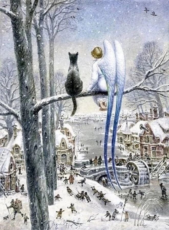 ДОБРАЯ СКАЗКА НА НОЧЬ.... Кошачий ангел, уже второй час сидел на заснеженной ветке дерева и наблюдал одну и ту же картину: приятная женщина, лет сорока, бегала по двору в поисках своего друга. «Снежок! Кис-кис-кис! Куда же ты запропастился?!» - плакала женщина. Она не могла понять, куда пропал ее любимец. Снежок никогда не выходил из квартиры, он был домашним котом и боялся улицу. - Видал? Тебя ищет...- сказал котячий ангелок, новому другу. - Вижу... Честно говоря, очень жаль ее. Мы почти тридцать лет вместе прожили. Как она теперь без меня будет? Ума не приложу...- тяжело вздохнул старый, белый кот. - Ты бы хоть попрощался с ней, видишь, бегает по морозу весь вечер. Надеется найти тебя, - с укором произнес ангелок. - Не мог я! Сначала хотел, но потом духу не хватило. Пусть лучше думает, что я убежал. Мне так легче будет, да и ей тоже..., - рассуждал Снежок. Тем временем началась сильная метелица, ветер продувал насквозь. Женщина скукожилась от холода, но не прекращала поиски.