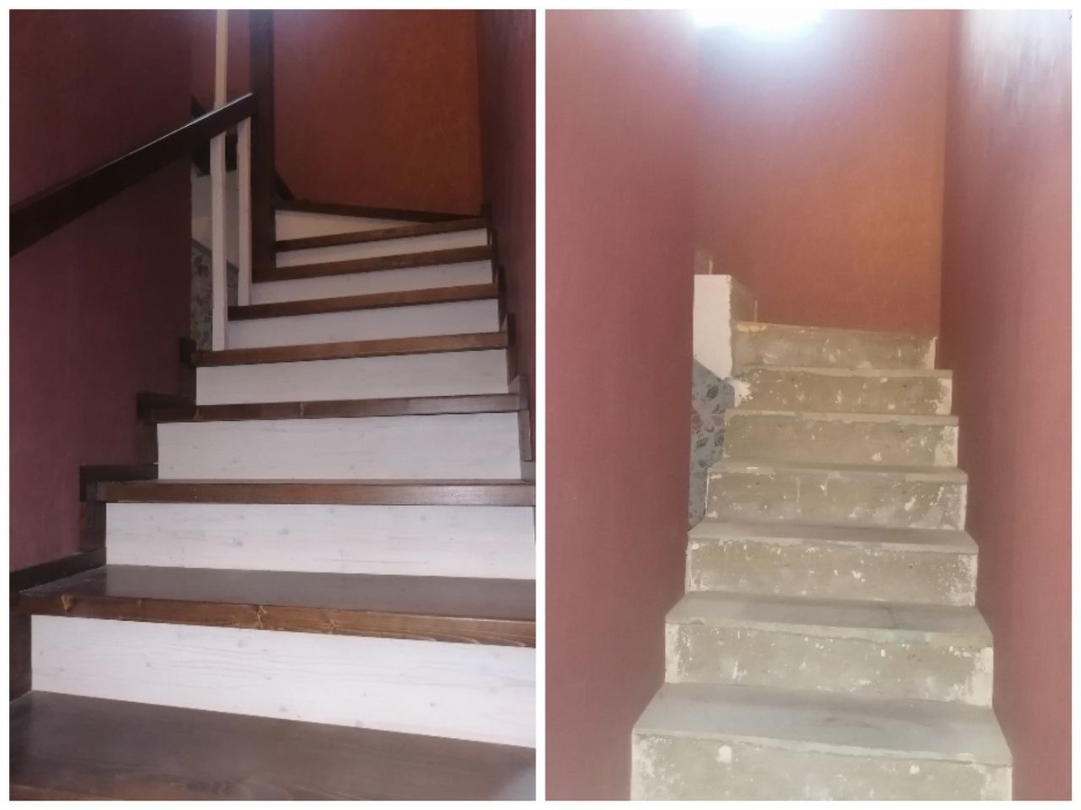 Возможна полная и частичная обшивка бетонной лестницы. В случае частичной из дерева выполняют только ступени, а проступи и стрингеры оформляют другими материалами. Полная обшивка создает иллюзию лестницы из дерева.