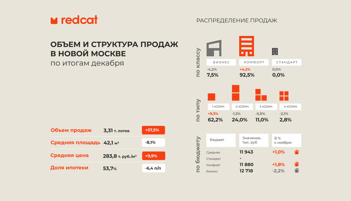 В декабре в Новой Москве спрос продемонстрировал взрывной рост, в результате последний месяц года смог подняться на второе место по объемам продаж за 2024 г., уступив только рекордным уровням июня. По итогам месяца в Новой Москве было продано 3,31 тыс. квартир и апартаментов, что на 57,5% больше, чем в ноябре. Объемы продаж отошли от минимальных значений конца лета- осени, но если сравнивать текущие показатели с прошлым годом, то снижение составляет около 19,4%. В декабре спрос более активно рос в сегменте комфорт-класса, доступные новостройки прибавили 65,0% по количеству сделок, а более дорогие – только 1,2%%. Так 92,5% (+4,2 п/п) всех сделок в Новой Москве приходится на новостройки комфорт-класса, доля бизнес-сегмента, сократилась на 4,2 п/п до 7,5%, продаж новостроек стандартного класса в декабре зафиксировано не было. Что касается структуры по количеству комнат, то основной прирост спроса сконцентрировался в сегменте компактных лотов (+85,1%), также высокие результаты показали дву