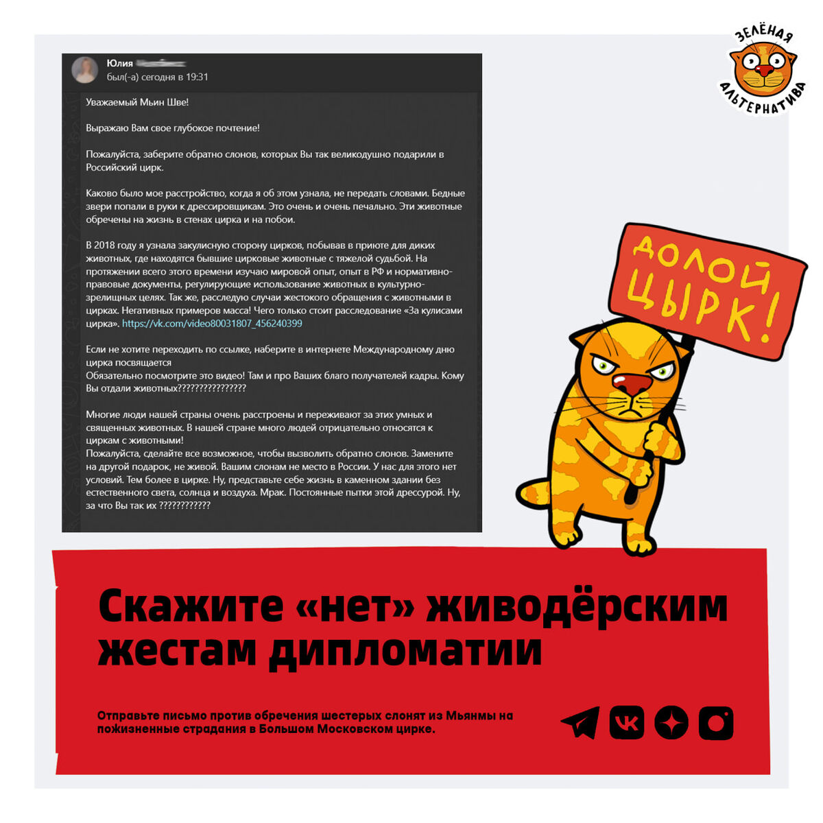 В иллюстрации к посту письмо нашей соратницы из Челябинска Юлии, которая была разбита новостью о передаче шестерых слонят правительством Мьянмы в Большой Московский цирк. Такой жест сделан в знак установления дружественных отношений между Россией и новой властью азиатской страны. Теперь малышей ждут годы жестоких дрессировок и карьера артистов, развлекающих отечественных венцов творения.