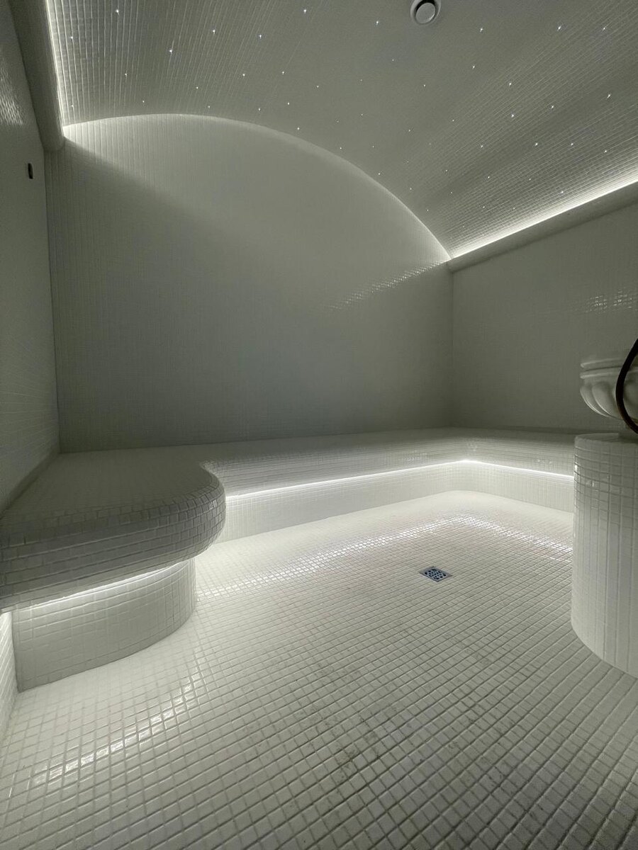 Приветствуем Вас на нашем проекте, сегодня проведем краткий фото обзор помещения хамам в одном из ФОК в Москве. Помещение небольшого размера с арочным потолком Стены, пол, потолок и сиденья - отделаны мозаикой в одном цвете, подсветка сидений и свода купола придают мягкости и уюта данной парной, а мерцающее звездное небо на куполе дает посетителям ощущения спокойствия, помогая расслабиться и насладиться ритуалом парения в хамам. Для омовения предусмотрена мраморная курна возносящаяся на пьедестале, расположение курны выполнено таким образом, что бы с любого расположения на сидении, посетители без труда могли подойти к курне не мешая при этом другим посетителям. Дыхание хамам осуществляет парогенератор Hygromatik FLE20-TSPA, данный парогенератор имеет удобный интерфейс и создает чистый и густой пар. Помните - что для расположения парогенератора нужно место вне помещения хамам. На этом наш мини обзор подошел к концу, если у Вас появились вопросы, мы с удовольствием на них ответим! Увид