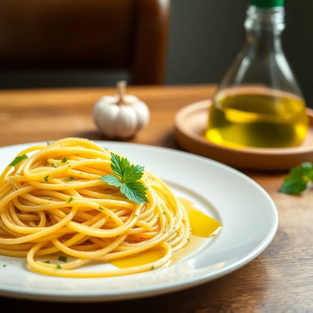 Сварите спагетти в подсоленной воде до состояния аль денте. Тем временем в сковороде на среднем огне разогрейте оливковое масло, добавьте мелко нарезанный чеснок и обжаривайте до легкого золотистого цвета, следите, чтобы он не подгорел! Добавьте готовые спагетти в сковороду, перемешайте, добавьте красный перец и нарезанную зелень. Вот и всё! Простота и шик!