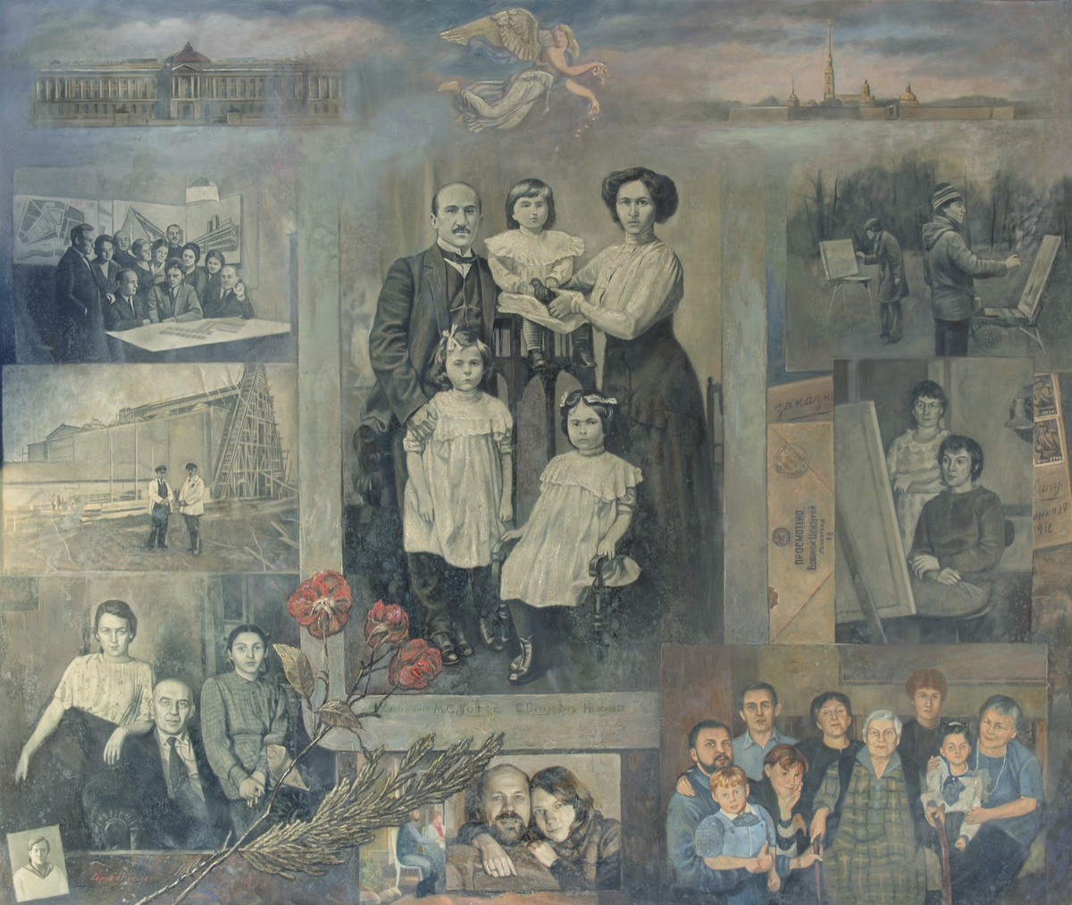 Прошел век. И я подумал, что надо помянуть Леночку, погибшую только-только распускавшуюся веточку нашего рода, которая не успела дать плоды. Сто лет – круглая дата. Точную дату ее смерти я не знал, на могилке только годы жизни (1907-1924), но это и не важно. Позвал маму, брата Павла, детей-внуков. Выпили, не чокаясь. И я вспомнил, что Павел (он художник) пару десятилетий назад писал такую любопытную картину-коллаж. Он взял несколько старых семейных фотографий, и как-бы перенес их в увеличенном размере маслом на холст. Картина большая – два метра на метр. В центре реплика на фотографию прадеда и прабабушки. Они, примерно в 1910 году, сфотографировались с дочерями в студии. Фотограф сделал композицию в традиционной манере для начала ХХ века. По периметру картины – реплики с фотографий из жизни последующих поколений: в основном, любительские съемки советского периода. Как бы такой коллаж жизни рода за столетие. А на переднем плане Павел нарисовал засохшие степные цветы. Эти цветы привезла Леночка из Крыма для своего гербария тогда, в 1924-ом году. И, о чудо, они сохранились в семейном архиве.