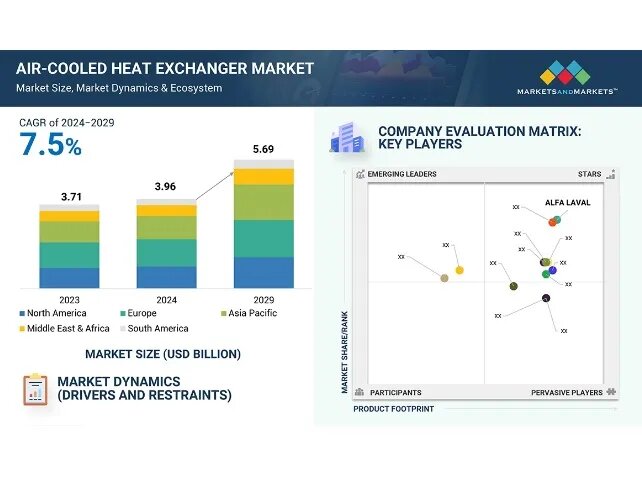 Согласно отчету «Рынок воздушных теплообменников по конструкции, материалам, типу, дизайну оребрения, мощности, конечным отраслям и регионам - мировой прогноз до 2029 года», объем рынка увеличится с $3,96 млрд в 2024 году до $5,69 млрд в 2029 году при среднегодовом темпе роста (CAGR) 7,5%.
