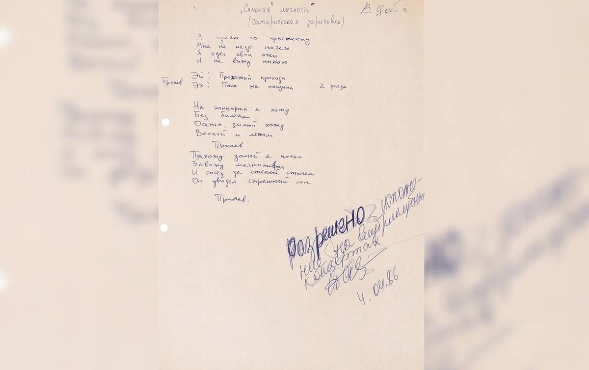 Рукопись песни «Прохожий» Виктора Цоя продадут на аукционе в Петербурге. Торги проведет аукционный дом «Литфонд» 23 января. В рукописи песня обозначена как «Сильная личность». Под текстом Нина Барановская, методист Ленинградского межсоюзного дома самодеятельного творчества, где работал рок-клуб, отметила, что исполнение композиции разрешено на внутриклубных мероприятиях. В Литфонде считают, что такое название для Виктора Цоя предложила сама Барановская, чтобы избежать потенциальных вопросов со стороны цензоров.