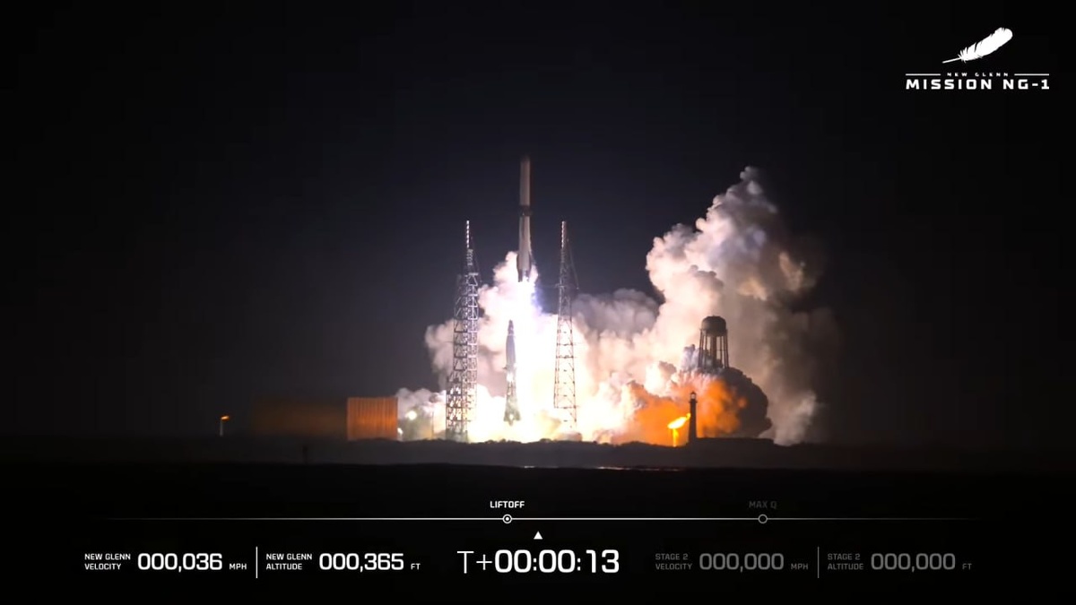 Сегодня в 10:03 по мск с LS-36 стартовала новая тяжёлая ракета — New Glenn. Это была уже вторая попытка запуска (первая была 14 января, закончилась переносом). После 3-ёх холдов (Hold — задержка) 7 двигателей Be-4 оторвали ракету от стартового стола. Первая ступень успешно отделилась, а ещё через 11 секунд два двигателя второй ступени — Be-3U — запустились для выхода на НОО. Далее первая ступень продолжила движение по баллистической траектории (без торможения), до Entry Burn. Для торможения при входе в атмосферу три двигателя успешно запустились. Они проработали 11 вместо 28 секунд. Скорость после RB составил 6.8 км/с К сожалению, по пока неизвестным причинам (теоретически из-за плазмы), связь со ступенью была потеряна. Через некоторое время были замечены горящие обломки, на траектории следования ступени. Blue Origin подтвердили, что ступень взовалась (теоретически из-за проблемы с системой наддува баков). Вторая ступень успешно вывела ПН на запланированную орбиту. Илон Маск поздравил