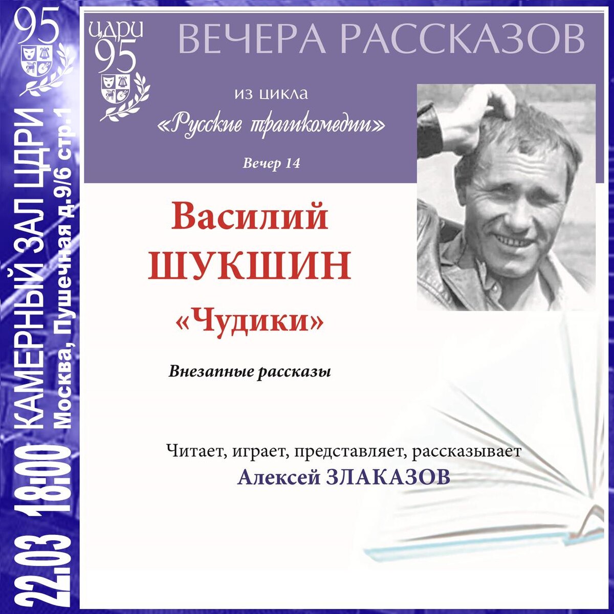 Вечер рассказов из цикла «Русские трагикомедии» «Жена называла его — Чудик. Иногда ласково. Чудик обладал одной особенностью: с ним постоянно что-нибудь случалось. Он не хотел этого, страдал, но то и дело влипал в какие-нибудь истории — мелкие, впрочем, но досадные». Василий Макарович Шукшин (1929–1974) — советский кинорежиссёр, киноактёр, сценарист и писатель. В 1958 году в журнале «Смена» был опубликован его первый рассказ «Двое на телеге». В 1956 году состоялся дебют Шукшина в кино: в фильме Сергея Герасимова «Тихий Дон» он сыграл в крошечном эпизоде, изобразив выглядывающего из-за плетня матроса. Первая книга Шукшина — «Сельские жители» — вышла в 1963 году, а Эдварда Кузьмина отмечала, что в лучших рассказах Шукшин демонстрирует «жизненное чутьё, зоркость, пластичность»: «писатель словно растворён в своих героях, смотрит их глазами». Рассказ «Чудик» был написан в 1967 году. Сюжет о странствии простодушного, деревен