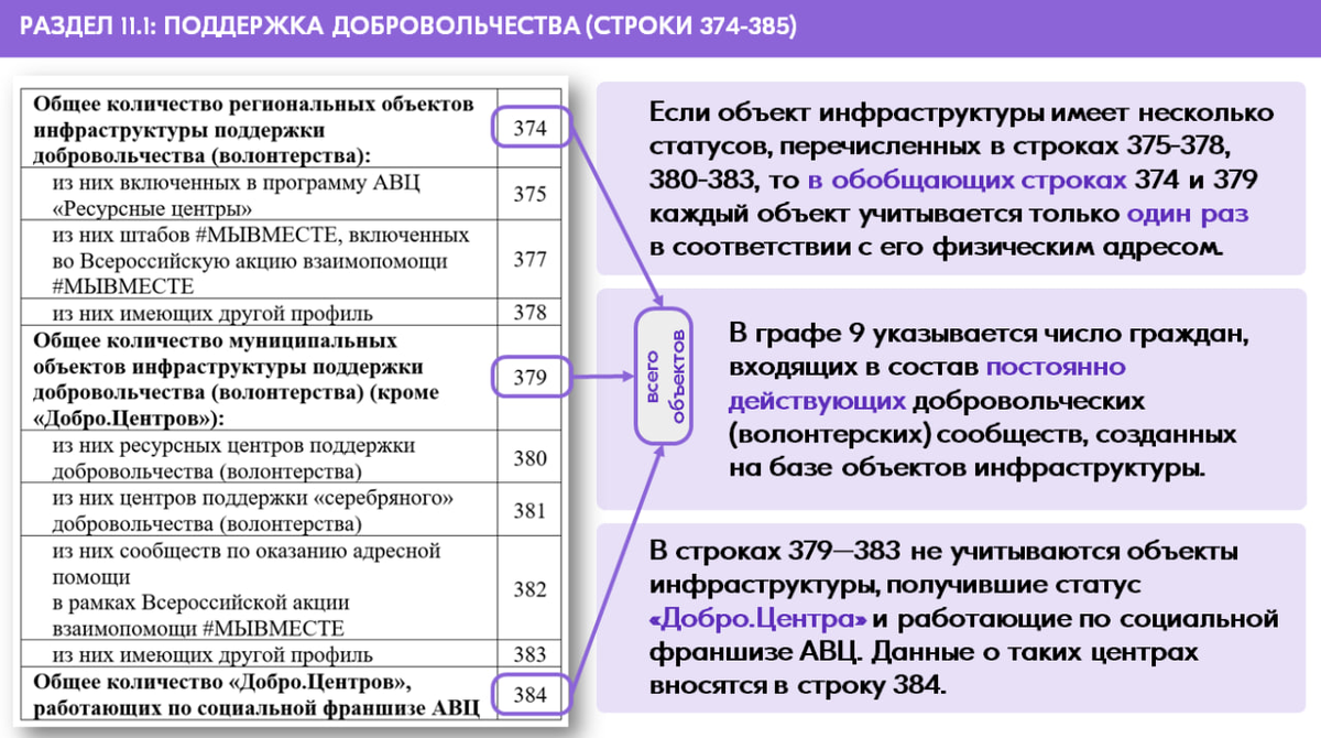 ❗️ В связи с тем, что разные по профилю центры поддержки добровольчества могут физически находиться в одном и том же объекте инфраструктуры добровольчества, в обобщающих строках 374, 379 в эксель-форме нет автосуммы. Чтобы внести верные данные в строки 374 /379 (всего региональных / муниципальных объектов инфраструктуры), необходимо сложить нижележащие строки (375+377+378 / 380+381+382+383), но не учитывать строку 376, т.к. в ней речь идет о том же ресурсном центре, что и в строке 375), а затем исключить задвоения, если центры находятся в одном и том же месте под общим руководством.