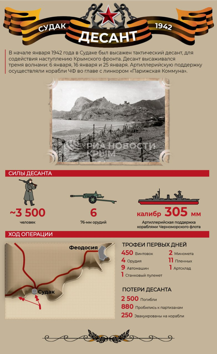 Сайт РИА Новости Крым начинает спецпроект "Защитники земли русской". Он посвящен героическим подвигам воинов, защищавших русскую землю и ее народ на протяжении многовековой истории нашей страны. Их доблесть, отвага и смелость навсегда вписаны в летопись воинской славы России. Проект приурочен к Году защитника Отечества. И вот первая дата: ровно 83 года назад, 16 января 1942 года, произошло одно из самых героических и при этом трагических событий Великой Отечественной войны – высадка тактического морского десанта в Судаке. Эта операция стала примером мужества, стойкости, самоотверженности и самопожертвования советских солдат. Подробнее о событиях тех дней — в нашей инфографике.