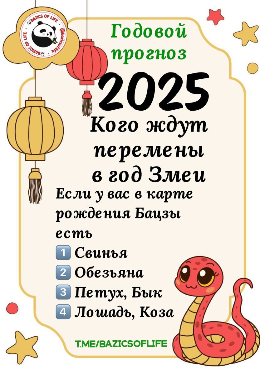 Нихао, друзья! В предыдущих сериях: Советы 🐍 Тенденции 🐍 Вопросы🐍 Когда приползет🐍 Подарки 🎁 Особенности знака 🐍 Виды 🐍 Кому ждать перемен Продолжаем разговор и сегодня оглашается список товарищей, наличие которых в карте рождения в год 🐍 тоже несет потенциал перемен. 1️⃣ Свинку мы уже рассмотрели - в 2025 она главная по переменам и изменениям! 2️⃣ На втором месте - Обезьяна! 3️⃣ Петух, Бык, Лошадь, Коза. С этой сельскохозяйственной и не очень компанией властительница года Змея дружит, поэтому считается, что перемены могут нести более мягкий характер. Чтобы понять какая сфера может быть затронута - смотрим, где в карте рождения они расположились: В году - это изменения у старших родичей, или связанные с учителями, начальниками, наставниками, тренерами, соцсетями. Изменения в вашей внешности. В месяце - изменения на работе, смена работы, новая деятельность. Изменения у родителей, у братьев/сестёр, друзей, коллег. А также у вас самих, если вы в возрастной категории 20-40 +-.