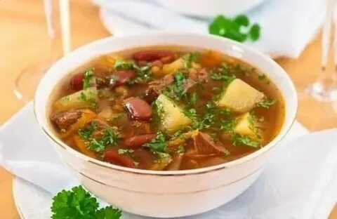 Мясной бульон варится из кусочков свинины. Лук и морковь обжариваются с квашеной капустой и томатной пастой. Суп с консервированной фасолью в томатном соусе получается наваристым и густым. Приятного аппетита!