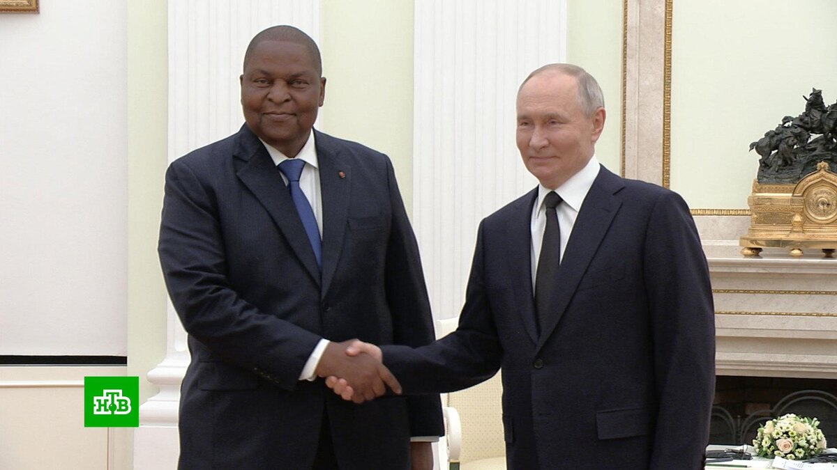 [ Смотреть видео на сайте НТВ ] Сегодня Владимир Путин провел в Кремле переговоры с президентом Центрально-Африканской республики Фостеном-Арканжем Туадерой, который находится в Москве с официальным визитом. Открывая встречу, Путин отметил, что в этом году отмечается 65-летие установления дипотношений между государствами, и поблагодарил гостя за внимание, которое он лично уделяет развитию сотрудничества с Россией. В частности, Путин отметил, что лидер ЦАР принимал участие в обоих саммитах Россия — Африка и в целом всегда содействовал укреплению связей Москвы с африканскими странами. Нынешний визит призван еще больше укрепить взаимодействие между Москвой и Банги. Владимир Путин, президент РФ: «Что касается торгово-экономических связей, то абсолютные величины пока не велики, но хочу отметить очень хорошую тенденцию: почти в восемь раз увеличился товарооборот за последний год. Это, в общем, неплохой показатель. Мы готовы при необходимости продолжить оказание и гуманитарной помощи — вы зна