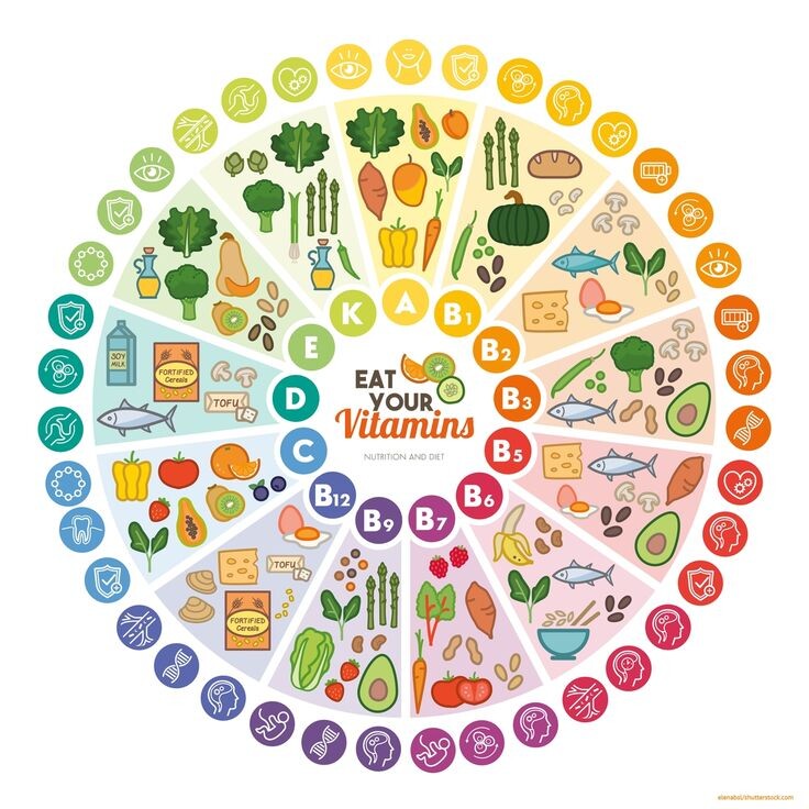 Продукты: цитрусовые, киви, брокколи, ягоды, красный перец. - Витамины группы B: играют важную роль в обмене веществ, нервной системе и кроветворении.