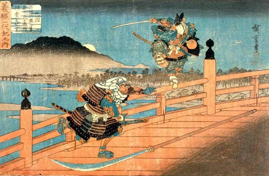 Согласно летописям, в семилетнем возрасте, прозябая в буддийском храме Курама-дэра, куда его определила мать — красавица Токива, подальше от кровавых распрей между Тайра и Минамото, Ёсицунэ всерьез увлекся фехтованием на мечах и вскоре достиг блестящих успехов. Одна из легенд всерьез утверждает, что его истинными учителями были демоны тэнгу — сказочные люди-птицы, которые считаются прародителями всех самурайских воинских искусств. Согласно другой легенде, 16-летний Ёсицунэ, отправившийся в муся-сюгэ (воинские странствия, предпринимаемые отдельными самураями, достигшими совершенства в каком-либо виде самурайских воинских искусств, с целью сразиться с достойными и сильными соперниками), как то повстречался с монахом-гигантом Бэнкэем, который в свое время поклялся, что сможет отнять 1000 мечей у самураев, проходящих по мосту Годзё в Киото. Виртуозно владевший тяжелым мечом и алебардой, монах уже собрал 999 мечей, после чего столкнулся с Ёсицунэ. Бэнкэй опрометчиво не увидел в молодом юноше достойного соперника, но, схлестнувшись с ним в бою, он был неприятно удивлен его умением парить воздухе, совершать невообразимые кульбиты и демонстрировать фехтовальные трюки, чему его научили тэнгу. Он был трижды повержен Ёсицунэ, после чего, узнав к тому же, что тот является сыном главы клана Минамото Ёситомо, проникся к нему великим уважением и поклялся служить ему верой и правдой до самой смерти, и он, как показали дальнейшие события, свою клятву сдержал.