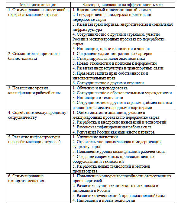 Таким образом, развитие глубокой переработки сырья внутри страны является эффективным направлением для снижения зависимости от экспорта сырья и импорта готовой продукции, и при правильной реализации предложенных мер оптимизации, Россия сможет укрепить свою экономику, улучшить торговый баланс и повысить качество своей продукции.
