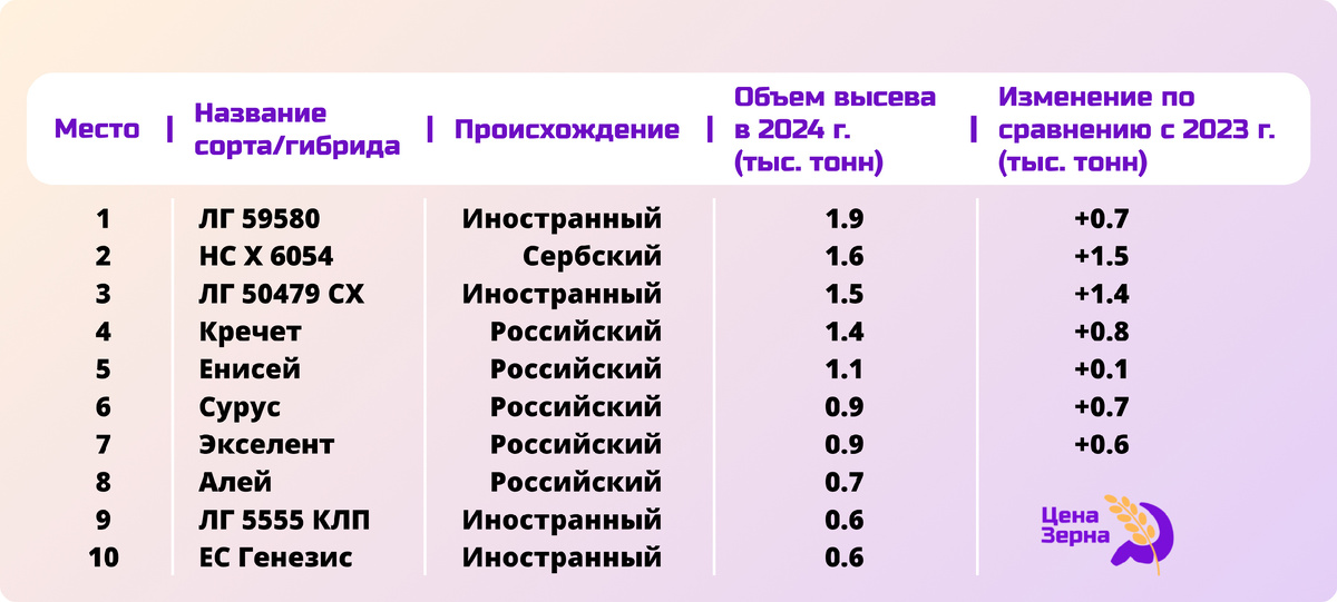 В 2024 году российские сорта и гибриды подсолнечника заняли половину мест в рейтинге по объемам высева, демонстрируя укрепление позиций отечественной селекции. Для сравнения, в 2023 году в топ-10 вошли только два российских гибрида. Лидером 2024 года стал иностранный гибрид ЛГ 59580, объем высева которого достиг 1,9 тыс. тонн, увеличившись на 700 тонн по сравнению с прошлым годом. Второе место занял сербский гибрид НС Х 6054 с кратным ростом объемов высева — с 0,1 до 1,6 тыс. тонн. На третьем месте — ЛГ 50479 СХ, чьи показатели выросли с 0,1 до 1,5 тыс. тонн. Среди российских гибридов наивысшую позицию занял Кречет, заняв четвертое место и поднявшись с девятой строчки рейтинга 2023 года. Также в топ-10 вошли сорта Енисей, Сурус, Экселент и Алей. Прошлогодние лидеры высева — гибриды компании «Сингента» (Сузука, НК Неома и Сумико) — в 2024 году выбыли из рейтинга. Кроме того, топ-10 покинули гибриды бренда «Пионер». Подробный рейтинг представлен в таблице ниже: