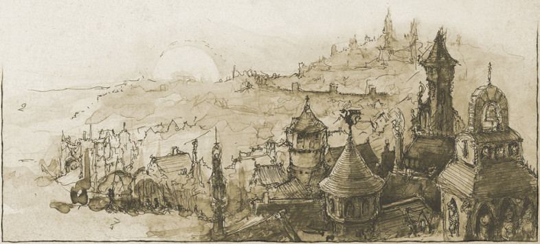 Обширный и неприступный, Мидденхейм – это кишащая масса людей, возвышающаяся на вершине Ульриксберга, отвесной скалы, выступающей из окружающего леса, как сломанный клык огромного волка. Четыре широкие дороги, построенные на высоких виадуках, поднимаются со дна леса, обеспечивая основной доступ к городу. Деревянные подъемные мосты, которые можно поднять, чтобы изолировать город во время войны, соединяют ворота с этими дорогами.