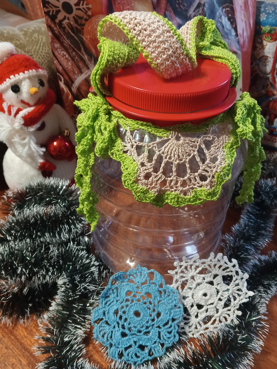 Вам понадобится: крючок, остатки тоненькой пряжи( типа "ирис") двух цветов. 1) связать тесьму салатового цвета по схеме 1 необходимой длины. 2) завязать тесьму вокруг банки. Поставить маркеры начала и конца окружности. Расчитать количество " веяров". По схеме 2 связать молочным цветом каждый "веер" отдельно, начиная вязание от середины мотива. По ходу вязания прикреплять "веер" к тесьме. 3) обвязать "веера" салатовым цветом по схеме 3. 4) Связать еще 2 тесьмы салатового цвета по схеме 1 необходимой длины. ( количество тесьмы зависит от количества "веяров"). 5) Слегка накрахмалить полученные элементы, высушить в горизонтальном положении, отпарить. 6) оформить банку. Сначала между "веярами" завязать бантиком тесьму. Затем всю тесьму завязать по верху банки.