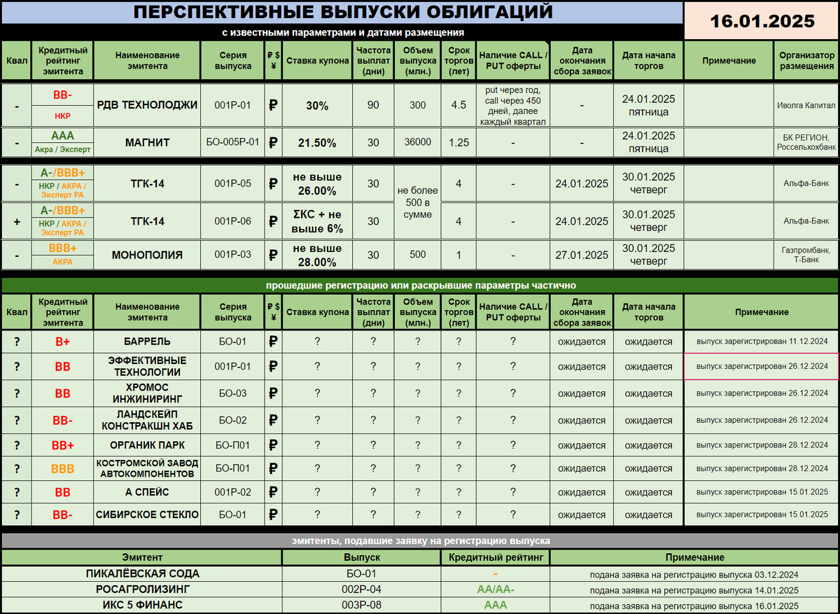 😏 Вечер добрый, леди и джентльмены! На рынке оживление, выстраивается небольшая группа желающих занять. Представлю всех поименно :) ---------- 🆕 НОВЫЕ РАЗМЕЩЕНИЯ / АНОНСЫ: ❄️ РДВ ТЕХНОЛОДЖИ (🅱️🅱️➖) сообщает, что размещение дебютного выпуска состоится 24 января. Параметры для первого явления на бирже очень спорные: 300 миллионов рублей, 4,5 года торгов, но с большими тонкостями. Пут-оферта уже через год, а через 450 дней заявлен call, и каждые 90 дней после этой знаменательной даты эмитент оставляет за собой возможность погашения выпуска по номиналу. Купонный период - те же 90 дней, ставка до оферты - 30%. Представляет собой компания производителя компьютерной техники, но это, на мой взгляд, не является уважительной причиной для крайне спорной купонной ставки. Организатор размещения - Иволга Капитал, для участия в первичке требуется предварительное согласование объема. ❄️ ТГК-14 (🅰️➖ / 🅱️🅱️🅱️➕), посмотрев на вакханалию в стаканах предыдущих размещений 001Р-03 $RU000A10AEF9