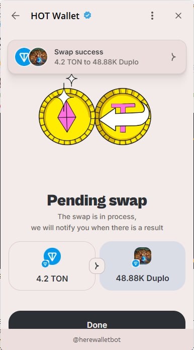 Если кому интересно, теперь свап-миссия на тоне 20+$ на Duplo, а в награду наоборот Darai Если раньше не делали свап-миссии на тоне, будьте предельно внимательны. Нужно ОБЯЗАТЕЛЬНО дождаться уведомления об успешном обмене, обязательно же нажать на него, и уже в этом окошке (а не в pending) появится бокс с наградой.