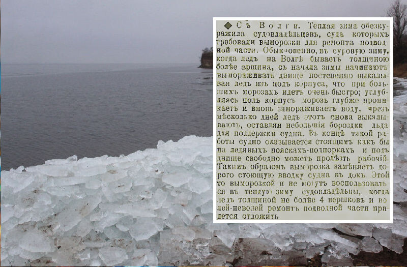В эти январские дни Волга у города Камышина Волгоградской области остаётся безо льда. По поверхности бродят небольшие волны и плавают утки. Температура воздуха около нуля градусов. Еще 10-20 лет назад в январе толщина льда достигала 30-40 сантиметров. Между Камышином и Николаевском возникала ледовая переправа, по которой из города в город по Волге передвигались на легковых автомобилях. Однако ещё в 1910 году, то есть 115 лет назад, случилась природная аномалия, когда лёд на Волге у Камышина был, как сообщает губернская газета «Саратовский вестник», не более 4 вершков. Вершок равен 4,4 см — по нашим временам весьма даже толстенный лёд! Однако в той же заметке сказано, что обычно в это время года толщина льда достигала более аршина, то есть более 70 сантиметров! Такой толщины льда у Камышина не отмечалось уже в 1980-1990 годы. 40-50 см стали нормой. А сегодня и 15-20 см, то есть 4-5 вершков кажутся крепкими. Сейчас-то вообще чистая вода!