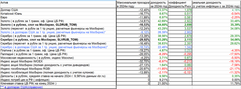 Перед вами таблица1 с перечнем этих активов с показателями доходности (и не только) по результатам 2024 года. Список открывают валюты: недружественные -евро и доллар США, и дружественные – китайский юань. Далее, золото. Оно представлено сразу в трех вариантах инвестиций. Почему так – спросите вы? Да потому что эти три варианта подразумевают три разных инструмента, и дают при этом несколько различные, хотя и близкие результаты. Во-первых, это официальная учетная цена на золото Банка России. Именно эта цена является определяющей в России для расчетов между банками и производителями золота, именно на эту цену ориентируются банки, устанавливая, например, цену продажи золота через ОМС или в тех же слитках. Инвестор может «привязаться» к этой цене, например, используя те же «золотые» облигации золотодобывающей компании ПАО Селигдар. Об этом инструменте я много писал, не будем останавливаться на нем, идем дальше. Дальше – это непосредственно биржевое золото, всем известный инструмент GOLDRUBTOM, он торгуется непосредственно на Мосбирже. Следом за ним – расчетные (то есть без реальной поставки золота) фьючерсы на Мосбирже. Фьючерсы эти торгуются в долларах за 1 тройскую унцию, казалось бы, это долларовый актив. Но поскольку, для инвестиций в золото с помощью этих фьючерсов на Мосбирже долларов не требуется, достаточно рублей, то этот вид инвестиций в золото мы приравниваем к рублевым инвестициям. В таблице произведен пересчет результатов года по этому инструменту в рубли. Но справочно представлен также и результат в долларах (выделен синим цветом в таблице). Он идет, так сказать, «вне конкурса». С золотом все перечислил, переходим к следующему драгметаллу – серебру. Здесь все то же самое – приведены результаты годовых инвестиций через официальную учетную цену, с помощью биржевого серебра (инструмент SILVERRUBTOM на Мосбирже), через расчетные долларовые фьючерсы на серебро (с пересчетом в рубли). Также справочно дан долларовый результат по серебряным фьючерсам (строка тоже выделена синим цветом в таблице). Но это еще не все драгметаллы в нашем списке – есть еще платина и палладий. Эти металлы представлены в России гораздо скромнее – непосредственно на Мосбирже они не торгуются, и ликвидных фьючерсов на Мосбирже на платину и палладий тоже нет. Вернее, они есть, но торгов реально нет. Ситуация со слитками и инвестиционными монетами из палладия и платины также не позволяет включить эти способы инвестиций в таблицу- спреды при продаже/выкупе в банках и у дилеров по монетам настолько большие, что сводят на нет все попытки подвести итоги инвестиций в эти металлы на таком коротком промежутке, как год. Но формально можно использовать официальную учетную рублевую цену ЦБ РФ для того, чтобы сравнить годовые итоги по платине и палладию с другими видами инвестиций. Далее, драгметаллы в нашем списке сменяет недвижимость. Здесь, конечно, в России все очень сложно, много разных видов недвижимости, много регионов со своими особенностями. Я поступил просто – взял индекс московской недвижимости, рассчитываемых Мосбиржей. Это индекс московской жилой недвижимости Москлик. Этот индекс рассчитывается Мосбиржей совместно с агенством недвижимости МосКлик. Я не буду сейчас углубляться в детали того, как и на основе каких данных Мосбиржа рассчитывает этот индекс, лю