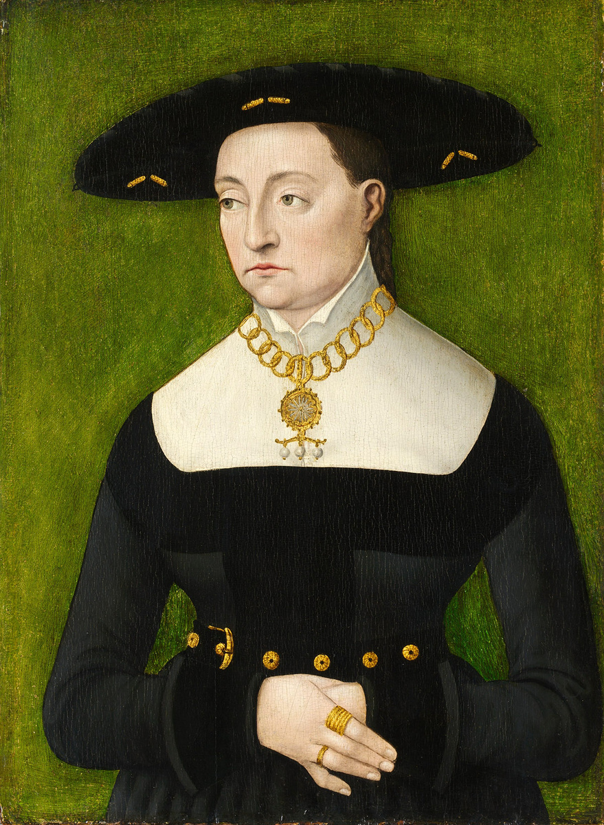 На этом портрете мы видим женщину, стоящую на зелёном фоне. Она повернула голову вбок и положили руку на руку в районе талии. На ней широкая чёрная шляпа Tellerbarett («шляпа-блюдо»), украшенная серой лентой по краю полей и золотыми эглетами. Её серое платье отделано чёрным на груди, талии и манжетах. Золотой с серебром кулон в виде солнечных лучей с тремя жемчужинами подвешен к золотому ожерелью. На видимой руке женщина носит золотые кольца. Хотя соответствующий мужской портрет неизвестен, вероятней всего, перед нами часть парных портретов мужа и жены. Незадолго до 1871 года фон был полностью переработан, и в процессе был удален верхний слой оригинального фона вместе со всеми надписями, которые он имел. В каталоге коллекции Гогенцоллернов в Зигмарингене, где впервые задокументирована картина, Ф. А. Ленер был первым, кто идентифицировал фон как переписанный. Он отметил, что надпись, сделанная более поздней рукой на обороте, вероятно, содержала информацию, которая была утеряна во вре