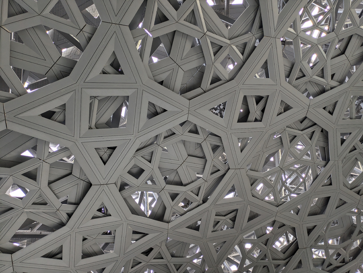 Огромное фойе под великолепным куполом, который, с одной стороны, кажется эталоном архитектуры хай-тек, однако если присмотреться, то он следует мусульманским традициям украшения зданий геометрическим узором! Браво, Жан Нувель!