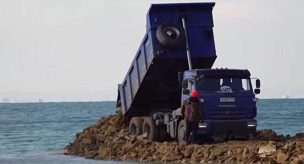 Задача до полуночи завершить. Такие работы проводятся нами впервые. Мы привозим большую крупную фракцию, большие камни, которые являются основанием. Сверху расклинцовываем более мелкой фракцией. Также необходимо произвести укладку железобетонных конструкций, которые защитят данную обваловку в случае, если начнется шторм, – рассказал заместитель губернатора Краснодарского края Евгений Пергун. Работают круглосуточно. Задействовали более 120 единиц тяжелой техники: экскаваторы, бульдозеры, погрузчики, самосвалы. Привлекли все транспортные предприятия края. В час разгружают от 10 до 15 самосвалов. В каждый грузовике в среднем по 25 тонн инертного материала. У нас уже отсыпано 150 метров со стороны моря. Идем еще со второго направления. Сделали дополнительную дорогу и начали отсыпать с северной стороны еще одну. Там проделано тоже порядка 100 метров, – рассказал руководитель Новороссийского дорожного филиала ГКУ КК «Краснодаравтодор» Николай Андрощук. Дамбу поднимают на метр выше уровня вод