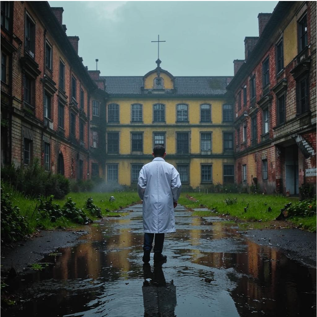 Марк стоял на крыльце старой, обветшалой психиатрической больницы №88, где стены здания, словно обшитые вековой усталостью, покрывались паутиной трещин, из которых местами сочилась зелёная плесень. Окна выглядели пустыми и тёмными, как глаза, утратившие блеск. Казалось, что само здание наблюдало за каждым входящим, оценивая его силу духа. Марк в своем новом, белоснежном халате, выглядел неуместно на фоне серого, потрескавшегося камня. Запах дезинфекции, лекарств и чего-то еще, сладковато-гнилостного, доносился из здания, вызывая неприятное ощущение.