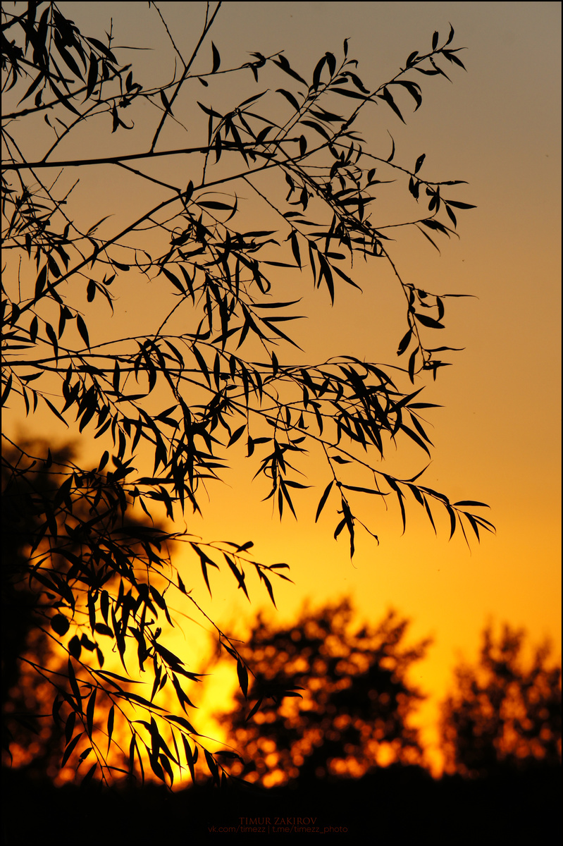 Это был поход невероятных дней и рассветов, но достаточно простых закатов. К вечеру второго дня, как и в предыдущий день, восторг переливался через край, и слишком большой мотивации искать правильное место для заката не было - впечатлений уже хватало. Но солнце садится, все желтеет, хочется к реке, а река в низине. Мозг все еще продолжает переваривать 2 последних прекрасных часа, где-то впереди пляж, солнце уже почти уходит в холм на том берегу - подъезжаем. Последние лучи, приходит некоторое разочарование на фоне перенасыщенного чудесами похода. Выдыхаю. Спокойно. Очень приятная поляна для ужина, удобнейший заход в Хопёр. И фотографий полная флешка - их достаточно... но все же может посмотреть на закат и через объектив, перед тем, как спокойно, провожая день, поесть? "Что может быть банальнее, чем силуэт веток на фоне заката?" - сотню раз такое сняв, думал я - и нажал на спуск. Потом на просмотр - увеличиваю, и понимаю, что снял 2 силуэта - резкий передний план и боке и