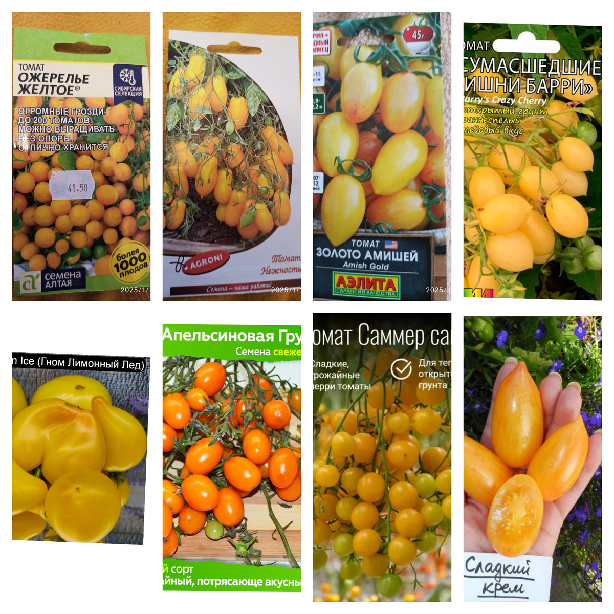 Руки чешутся. Зуд нетерпения нарастает 😁 ну когда уже можно начать посадочный сезон!? Сдерживаю себя, перебираю пакетики, читаю старые записи, докупаю последние семена. Ну и составляю планы. В прошлом году мне понравилось составлять план по сортам в виде коллажа. Достаточно наглядно. В этом году улучшила их вид - собираю по цветам. Разделила условно на жёлтые, красные, зелёные, антоциановые, полосатые. Жёлтые вышли самой большой группой - тут аж 8 сортов. Из них: Гном лимонный лёд (или лимонное мороженое) - взяла у коллекционера. Сердца весом 100-150 гр. Хвалят за вкус. Сладкий крем - сорт Бреда Гейтса, взяла у коллекционера. Сливки 50-60 гр. Золото Амишей - от Аэлиты. В планах посадки с прошлого года. Буду сравнить с сортом Золотая россыпь. Тоже сливки 35-45 гр. Саммер сан и сумасшедшие вишни Барри - повтор с прошлого года. Понравились. Известные уже сорта. Ожерелье жёлтое от Семена Алтая - впечатлилась описанием от производителя. Обещают до 200 томатов в кисти. Очень хотело