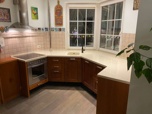 Позвольте представить вашему вниманию одну из работ, выполненных компанией «Каменная Корпорация»: С-образную столешницу из акрилового камня Hanex с интегрированной мойкой. Столешницы из искусственного камня традиционно являются наиболее популярными из всех заказываемых изделий. Объясняется это тем, что акриловый камень – едва ли не лучший материал, подходящий для этой цели. Этот материал прочен и износостоек, отличается высочайшей гигиеничностью и прост в уходе, в случае повреждений легко поддается восстановлению, а также очень гибок и в руках профессионалов может приобретать буквально любые формы. Также он доступен в широчайшем модельном и цветовом разнообразии и отличается вполне доступной стоимостью. Мало какой материал обладает тем же набором качеств! Выбранный для изготовления столешницы и мойки акриловый камень Hanex T-102 Hidden Glen – это продукция южнокорейского производителя, представленного на рынке с 2000-х годов. Акриловый камень Hanex – это в равной степени сочетание прак