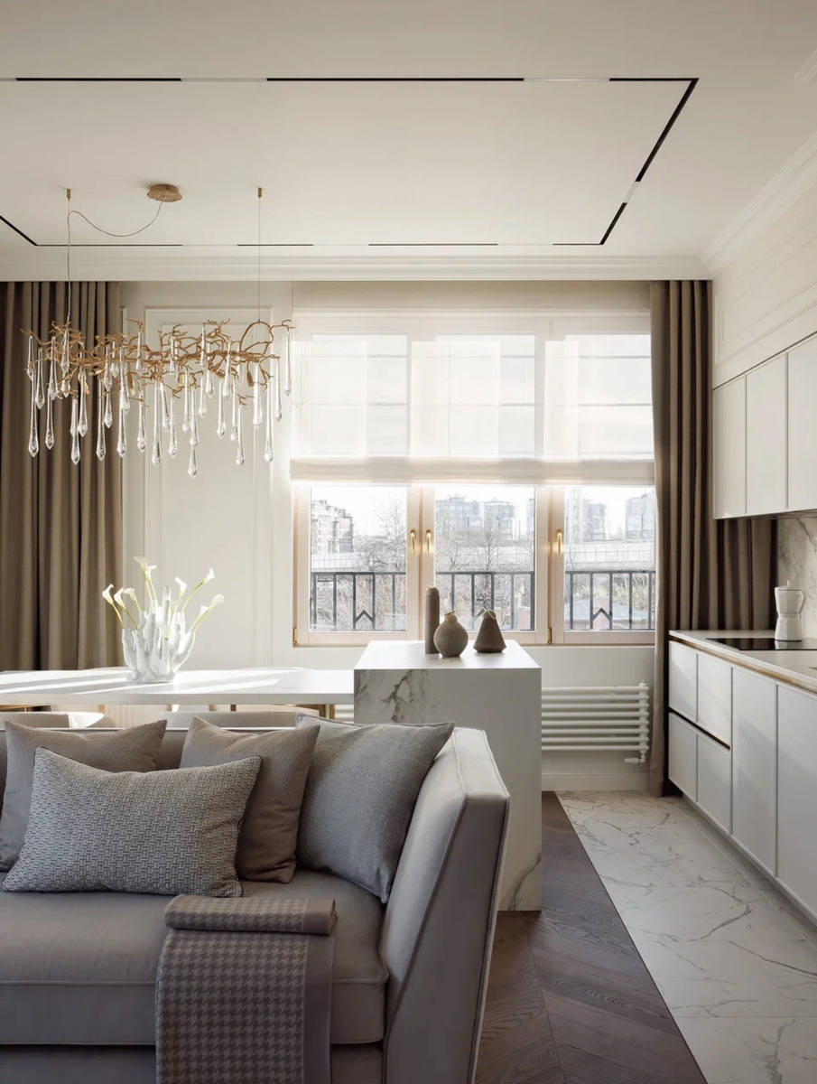 Например, в одном из наших проектов основным цветом стала кремовая палитра, дополнительным — нежно-серый, а акцентом — золотистые детали. Это решение сделало интерьер одновременно спокойным и элегантным.