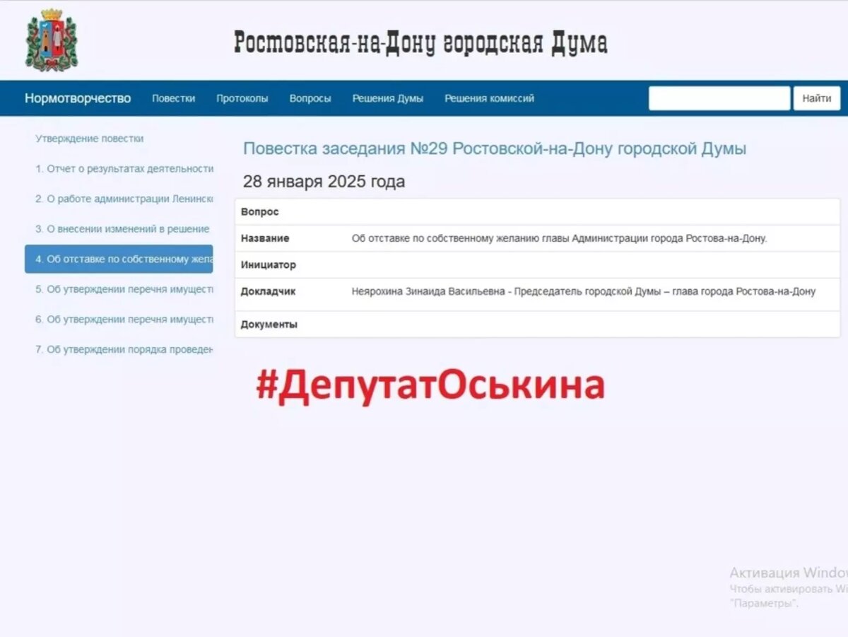 Вечером 16 января слухи о досрочном уходе Алексея Логвиненко подтвердились. В соцсетях депутата гордумы Натальи Оськиной появился скрин с сайта администрации в закрытом разделе для депутатов. В нем информация о внеочередном заседании городской думы 28 января. На повестке – вопрос: «Об отставке по собственному желанию главы администрации Ростова-на-Дону».