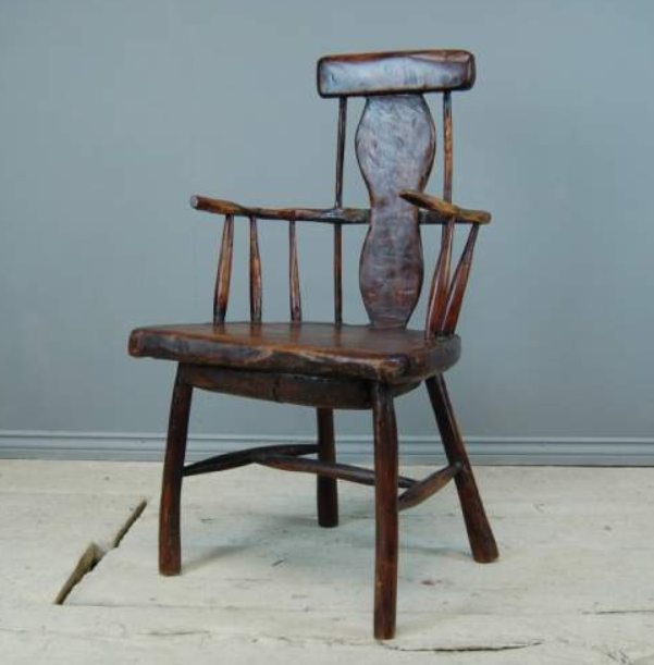«Немного странное, невероятно примитивное валлийское кресло. Тис и вяз. С различными улучшениями, наиболее примечательным из которых является дополнительная плита сиденья, предположительно использованная для ремонта существующего сиденья. Замечательный вид и ощущение. Родом из долины Хедс, Уэльс, 19 век. Размеры: 51 см x 93 см x 45 см. ПРОДАНО».