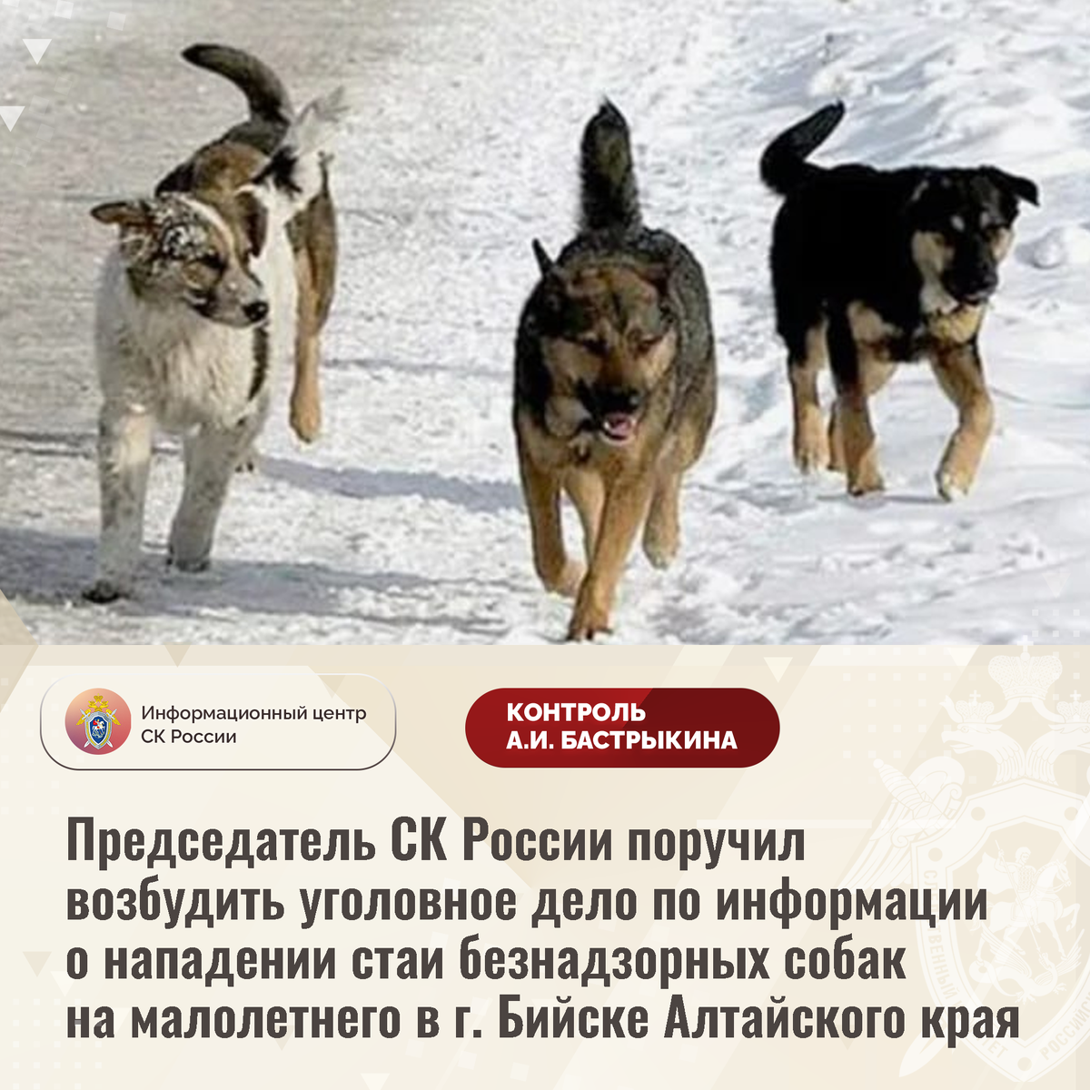 Председатель СК России поручил возбудить уголовное дело по информации о нападении стаи безнадзорных собак на малолетнего в г. Бийске Алтайского края В социальной сети сообщается, что 14 января текущего года в городе Бийске Алтайского края стая бродячих собак набросилась на 11-летнего мальчика, укусив за руку и повредив верхнюю одежду. Отмечается, что ранее эти же агрессивные животные нападали на других детей, однако мер к отлову бездомных собак не принимается. В СУ СК России по Алтайскому краю по данному факту организована процессуальная проверка. Председатель Следственного комитета Российской Федерации Александр Иванович Бастрыкин поручил руководителю СУ СК России по Алтайскому краю Игорю Владимировичу Колесниченко возбудить уголовное дело и представить доклад о предварительных и окончательных результатах его расследования. Исполнение поручения поставлено на контроль в центральном аппарате ведомства. #СледственныйКомитет #СКРоссии #СКР #ИЦСКР #Информационныйцентр #АлександрБастрыкин